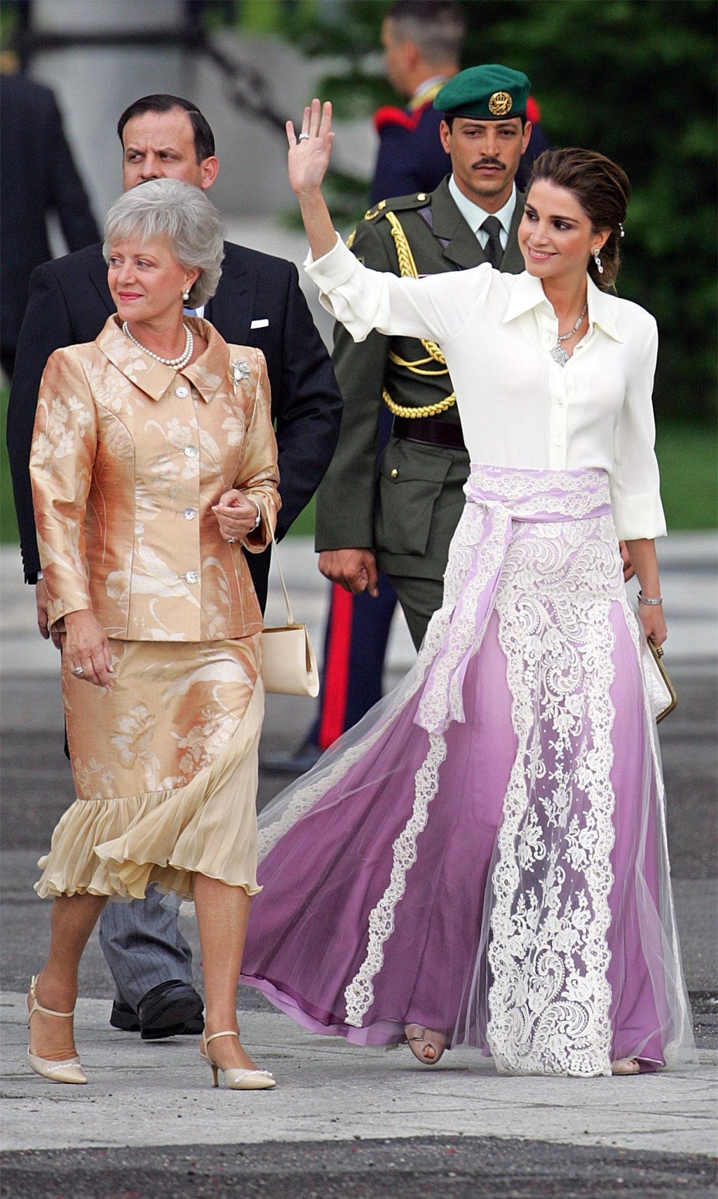 Vào ban ngày, hoàng hậu chuyển từ kiểu công sở thành hình tượng thanh lịch, đứng đắn. Đôi khi, người ta có lẽ sẽ quên Rania là người Palestine. Cách ăn mặc khiến bà giống phụ nữ châu Âu giàu có.