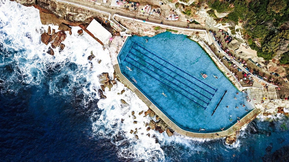 Bronte Baths, Sydney, Australia: Nằm trên bãi biển Bronte, hồ bơi Bronte Baths được xây dựng nép vào sườn núi đá, có cầu thang dẫn xuống và một thanh chắn bằng gỗ ngăn cách với mặt biển. Điểm ấn tượng nhất của Bronte Baths là hình cây đàn ghita độc đáo khi nhìn từ trên cao. Tận hưởng những phút giây thư giãn tại đây, du khách không chỉ thỏa thích bơi lội mà còn có thể cảnh ngắm Mặt Trời mọc tuyệt đẹp trên biển. Ảnh: Shutterstock.