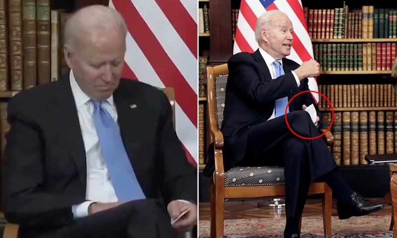 Tổng thống Mỹ chăm chú nhìn mẩu giấy nhớ khi gặp thượng đỉnh Tổng thống Nga tại Thụy Sĩ, song hiện chưa rõ nội dung bên trong.