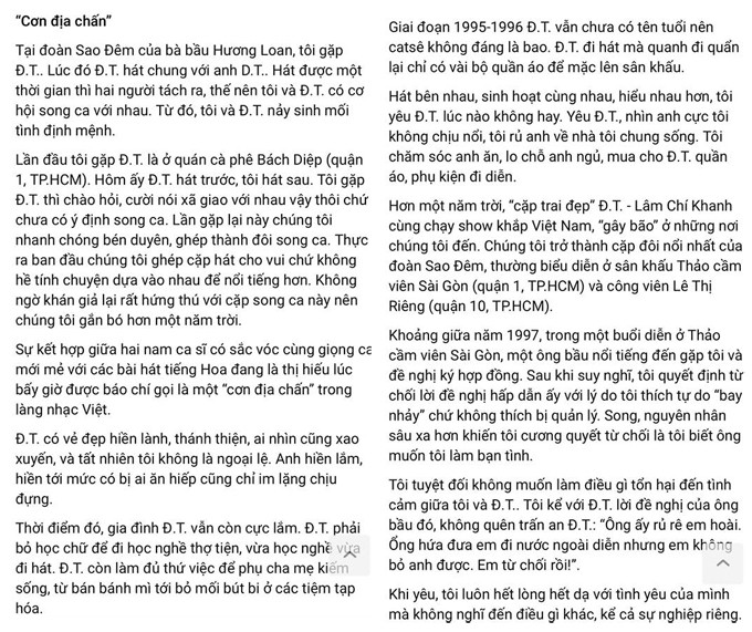 Mới đây nhất, cư dân mạng đổ dồn chú ý vào câu chuyện Lâm Khánh Chi viết tự truyện vào năm 2017 và thừa nhận từng yêu một nam ca sĩ tên Đ.T. Rất nhiều người nghi ngờ nhân vật Đ.T ở đây chính là tên viết tắt của Đan Trường.