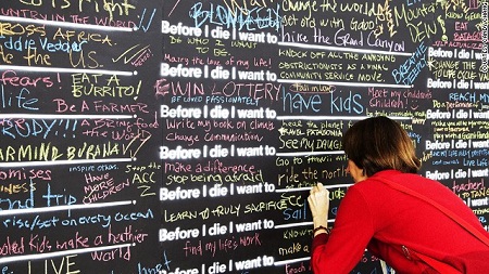 Trên mặt tường có viết rất nhiều dòng chữ “Trước khi tôi chết, tôi muốn…”, phần bỏ trống trong câu là để dành cho những người qua đường hoàn thành nốt.