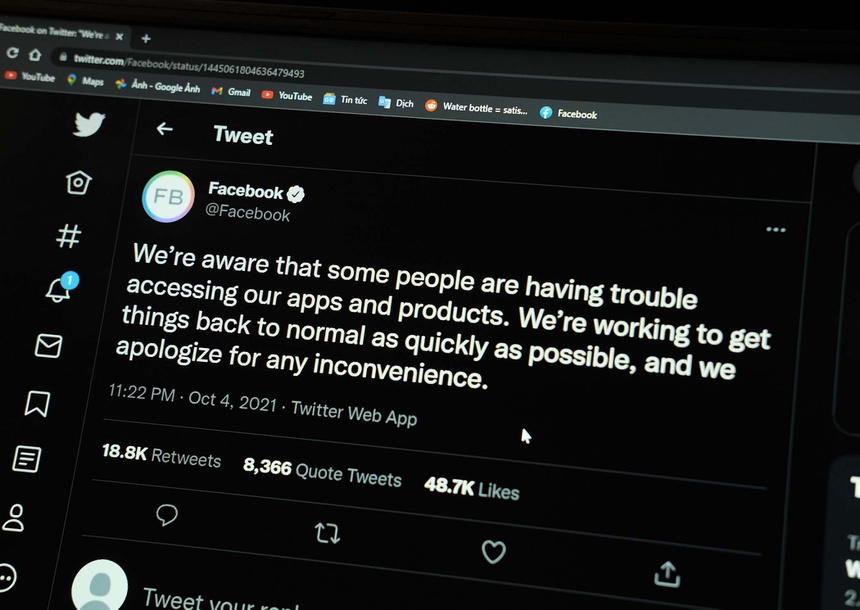 Tối 4/10, hàng loạt dịch vụ của Facebook không thể truy cập trên toàn cầu. Công ty này phải sử dụng Twitter, mạng xã hội đối thủ để thông báo về tình trạng không thể truy cập diện rộng.