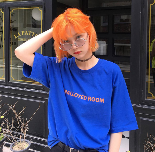 Tóc màu cam rực được cô nàng này phối với outfit rất chất gồm áo thun rộng, vòng choker và kính mắt trẻ trung. Họa tiết trên áo có màu sắc ton-sur-ton màu tóc tạo nên tinh tế khi mix đồ.