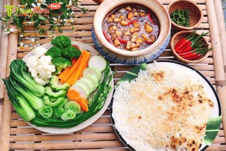 Rau củ ăn kèm bạn luộc chín, bày ra đĩa, dọn cùng nồi kho quẹt là có thể thưởng thức với cơm trắng, cơm cháy tùy thích.