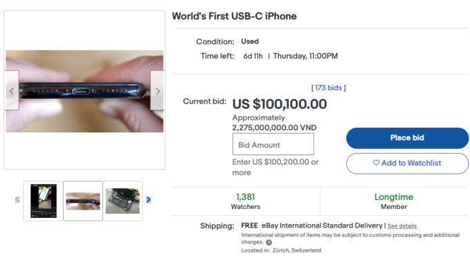 Ken Pillone đã thay cổng Lighting thành USB-C cho iPhone X của ông và đem đấu giá trên eBay với mức khởi điểm 5.000 USD (113,4 triệu đồng). Sau hơn một ngày xuất hiện, thiết bị thu hút 173 người tham gia đấu giá và số tiền được trả cao nhất là 100.100 USD (gần 2,3 tỷ đồng). Con số này được dự đoán tiếp tục tăng, do thời gian đấu giá vẫn còn 6 ngày.