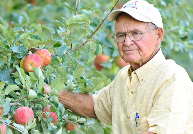 Tom Mathison và quả táo mang tem công ty Stemilt Growers của ông.