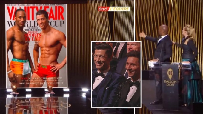 Bức ảnh vốn là trang bìa tạp chí Vanity Fair với Ronaldo và Didier Drogba mặc đồ lót quảng cáo. Drogba, với tư cách là người dẫn chương trình, tỏ ra không vui. Cựu tiền đạo lừng danh của Chelsea và Bờ Biển Ngà quay sang hỏi bạn dẫn - nữ MC Sandy Heribert rằng, tại sao ban tổ chức lại đưa hình ảnh này lên. Không ai biết anh hỏi thật hay nằm trong kịch bản.