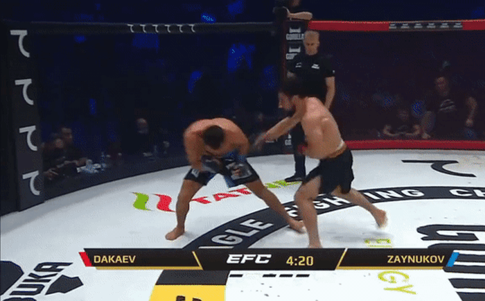Trận so tài giữa võ sĩ MMA Mehdi Dakaev và đối thủ Makkasharip Zaynukov diễn ra trong sự kiện Eagle FC 43 tại Nga vào sáng 11/12. Mahdi Dakaev thi đấu lấn lướt từ sau nửa hiệp đầu tiên dù Zaynukov mới là người chủ động ra đòn trước. Cả 2 võ sĩ đều triển khai lối đánh phòng thủ và thăm dò bằng những đòn jab ở cự ly gần.