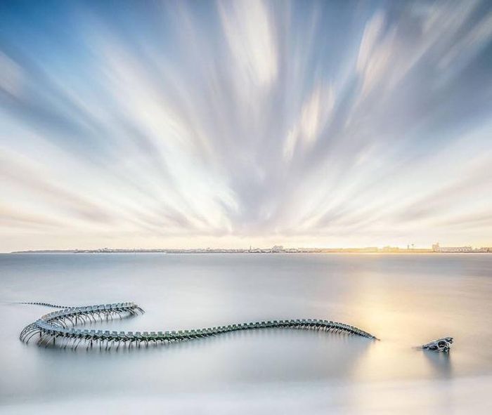 Không chỉ lãng mạn, Pháp còn là một đất nước nổi tiếng với nhiều công trình nghệ thuật đặc sắc. Năm 2012, một người tên Huang Yong Ping đã thiết kế và xây dựng bộ xương rắn khổng lồ bên một bờ biển hoang vu ở Pháp.