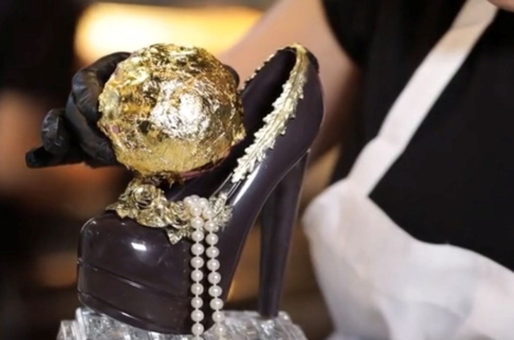 Bánh được đặt trên một chiếc giày cao gót bằng chocolate, với chân đế là một chiếc cốc pha lê và trang trí thêm bằng những bông hoa hồng chocolate vô cùng bắt mắt.