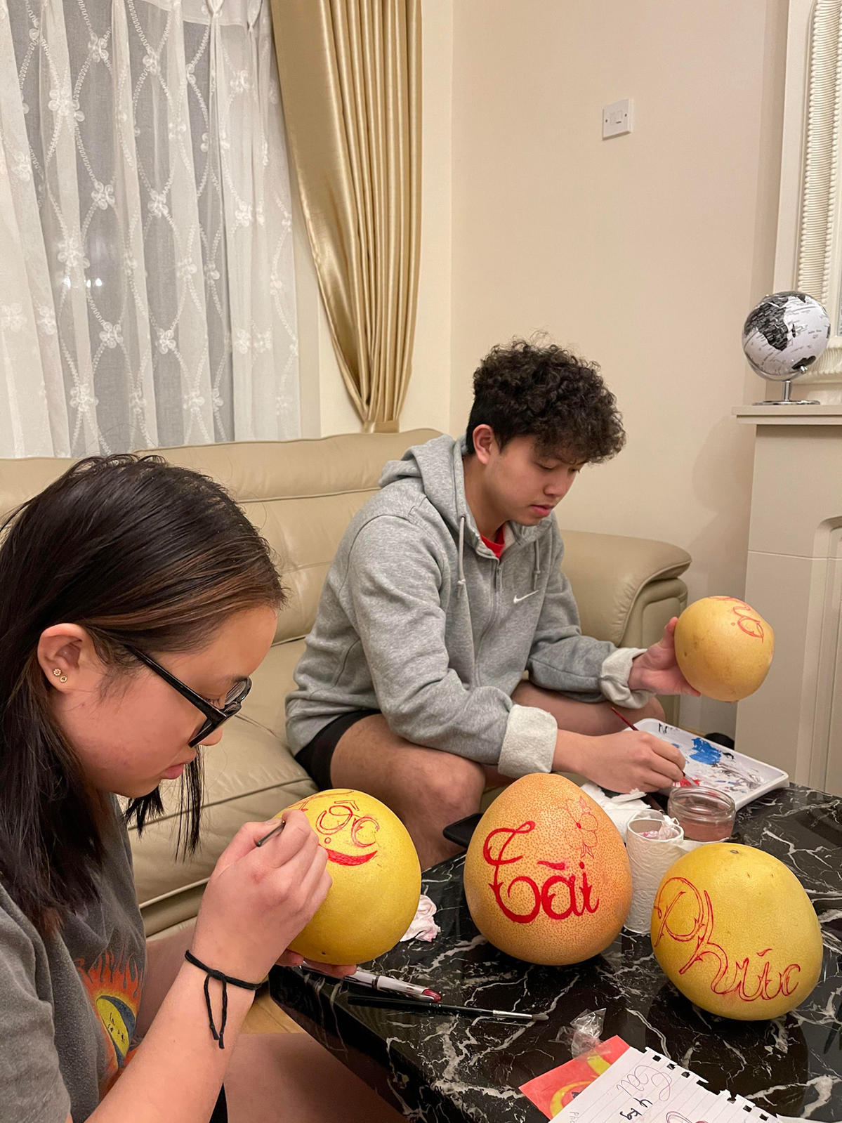 Đào, quất đón xuân của gia đình anh Vinh Lê. Các con anh tự tay khắc, viết chữ lên quả chưng Tết. Ảnh nhân vật cung cấp