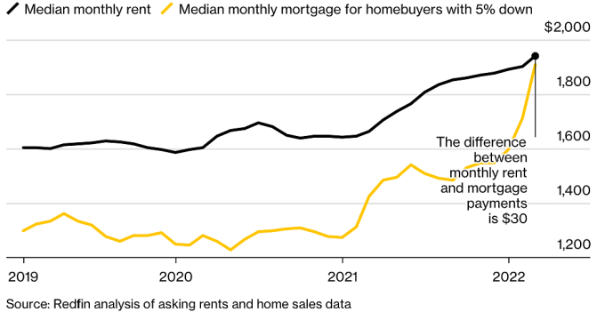 Trong lịch sử, trung bình chi phí hàng tháng phải trả khi vay mua nhà thấp hơn nhiều so với chi phí đi thuê, chủ yếu là do các căn hộ cho thuê tập trung ở các thành phố đắt đỏ như New York và San Francisco. Trong khi đó, nhà được mua thường có giá trị thấp, do nằm ở các khu vực ngoại ô và nông thôn, nhưng mức độ chênh lệch đã bốc hơi sau khi chi phí đi vay tăng vọt.