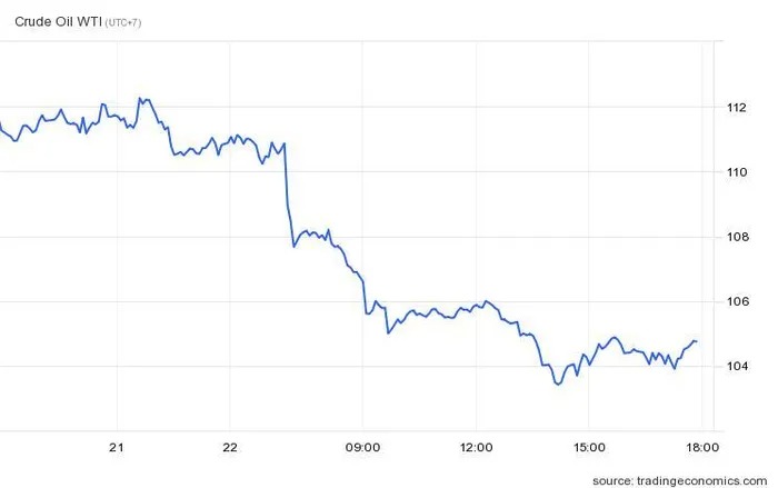 Theo dữ liệu của Trading Economics hôm 22/6 (theo giờ Việt Nam), giá dầu WTI đã lao dốc mạnh 6,04 USD/thùng, tương đương 5,45% so với 24 giờ trước đó, xuống 104,6 USD/thùng. Trong khi đó, giá dầu Brent tiêu chuẩn toàn cầu giảm 4,55 USD/thùng (3,96%) còn 110,1 USD/thùng.