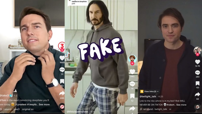 Các video deepfake về Tom Cruise (trái), Keanu Reeves (giữa) và Robert Pattinson (phải) trên TikTok.