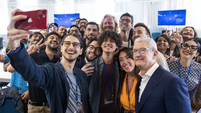 Tim Cook chụp ảnh cùng các học viên tại App Developer Academy. Ảnh: Brooks Kraft