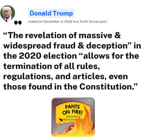 "So, with the revelation of MASSIVE & WIDESPREAD FRAUD & DECEPTION in working closely with Big Tech Companies, the DNC, & the Democrat Party, do you throw the Presidential Election Results of 2020 OUT and declare the RIGHTFUL WINNER, or do you have a NEW ELECTION?" Trump said Dec. 3 on Truth Social. "A Massive Fraud of this type and magnitude allows for the termination of all rules, regulations, and articles, even those found in the Constitution. Our great ‘Founders’ did not want, and would not condone, False & Fraudulent Elections!"