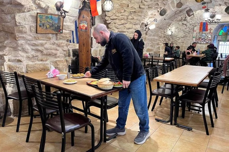 Người đồng sở hữu thế hệ thứ tư của nhà hàng Afteem, Ala'a Salameh, 42 tuổi, đặt thức ăn lên bàn bên trong nhà hàng ở Bethlehem - Ảnh: REUTERS