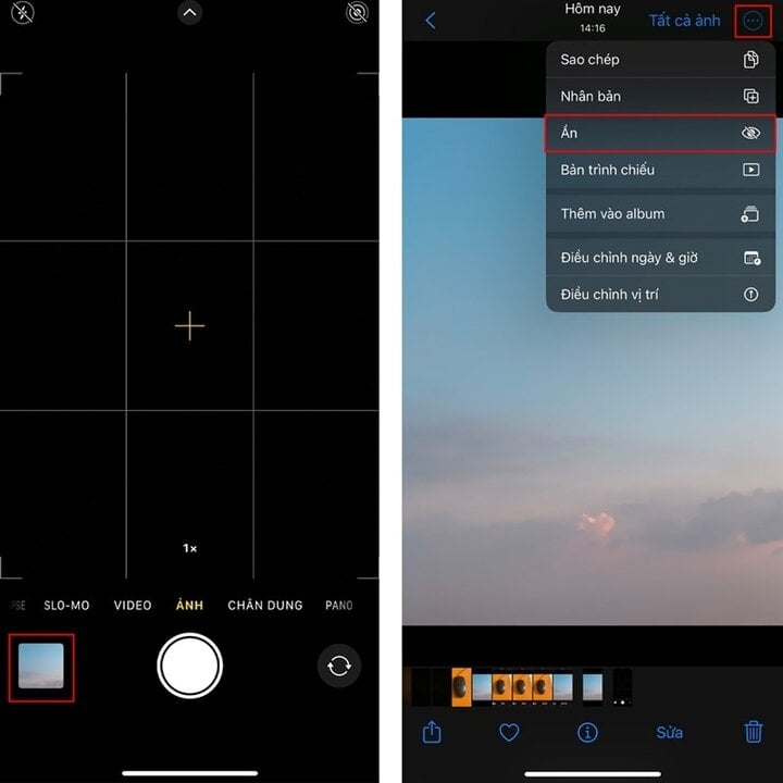 Các bạn thao tác như sau, ngay tại ứng dụng camera, sau khi các bạn đã chụp xong bức ảnh nhấn ngay vào ảnh bên phía dưới góc trái màn hình, chọn tiếp tục kích vào biểu tượng 3 chấm và chọn "Ẩn".
