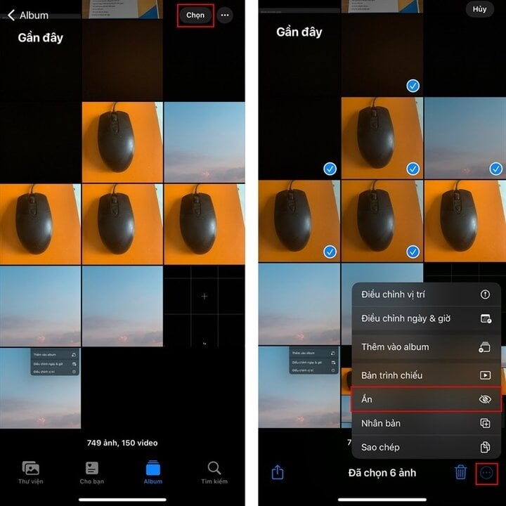 Ngoài ra để ẩn 1 hoặc nhiều ảnh cùng lúc cũng rất đơn giản, các bạn truy cập vào album, nhấn "Chọn" nằm ở phía bên trên góc phải màn hình, sau đó bạn chỉ việc tích chọn vào các bức ảnh bạn muốn ẩn rồi nhấn vào biểu tượng 3 chấm ở phía dưới góc bên trái màn hình chọn "Ẩn" là xong.