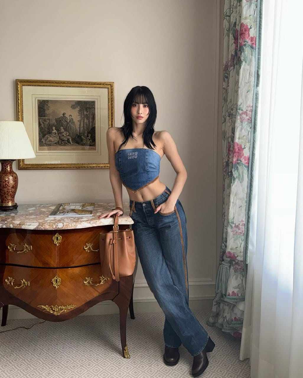 H́nh ảnh nữ idol Momo (Twice) trong Miu Miu FW24 Show thuộc khuôn khổ Paris Fashion Week 2024 được chia sẻ nhiều trên các diễn đàn Kpop. Trong thiết kế áo yếm hở trọn lưng phối cùng quần jeans. Cô nàng khoe trọn cơ bụng số 11 cùng đường cong h́nh thể nóng bỏng.