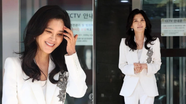 Xuất hiện trước khách sạn Shilla, Lee Boo-jin nổi bật trong bộ vest trắng thuộc thương hiệu cao cấp Anh Alexander McQueen và nhấn nhá trang phục bằng cài áo đính đá lấp lánh cùng trang sức tinh tế.