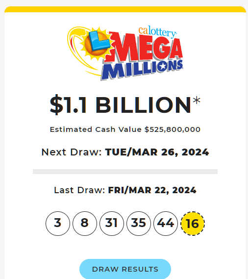 Kỳ quay số Mega Millions hôm thứ Sáu không có người thắng lớn nhưng một vé được bán ở quận Riverside County, California hiện có giá trị gần 3/4 của 1 triệu Mỹ Kim. Xổ số California cho biết không có ai trúng cả 5 số và số Mega, nhưng một vé bán ra khớp với 5 số đó. Chiếc vé đó được bán tại trạm xăng Shell nằm ở số 2192 phố West Ramsey ở Banning. Các số trúng thưởng là 3, 8, 31, 35, 44 với số mega là 16. Nếu một người may mắn trúng giải độc đắc, tất nhiên số tiền đó sẽ trị giá 977 triệu Mỹ Kim – trước khi bị trừ thuế. Đối với kỳ quay tiếp theo vào ngày thứ Ba, giải độc đắc sẽ có giá trị đáng kinh ngạc là 1.1 tỷ Mỹ Kim. Con số đó dự kiến trị giá hơn 500 triệu Mỹ Kim tiền mặt.