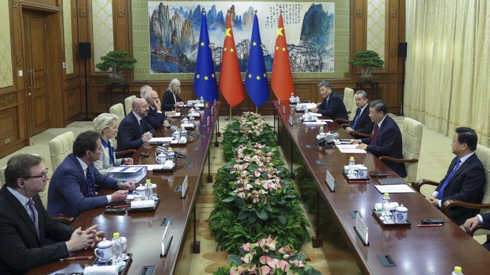 Đoàn Trung Quốc dẫn đầu là chủ tịch Tập Cận Bình (phải) và đoàn Liên Hiệp Châu Âu do chủ tịch Hội Đồng Châu Âu Charles Michel dẫn đầu tại hội nghị thượng đỉnh song phương, Điếu Ngư Đài, Bắc Kinh, ngày 07/12/2023. AP - Liu Bin