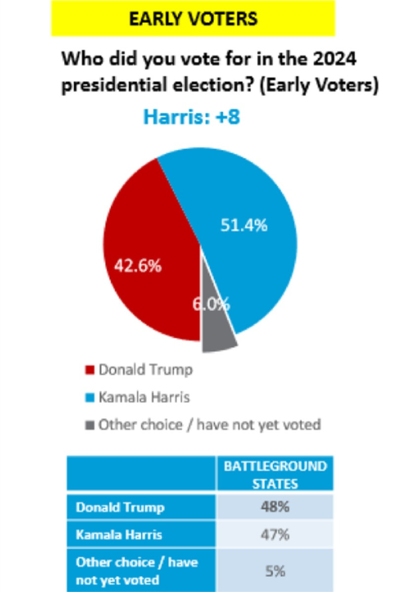 Tuy nhiên, số liệu khảo sát từ các cử tri bỏ phiếu sớm tính trên toàn nước Mỹ lại cho thấy bà Harris đang bỏ xa ông Trump với tỷ lệ ủng hộ lần lượt là 51% và 43%.