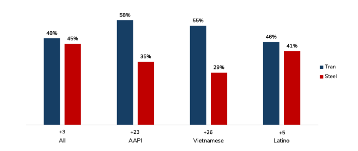 Kết quả thăm dò mới nhất từ Ủy Ban Đảng Dân Chủ Vận Động Bầu Cử Quốc Hội (DCCC) hôm 22 Tháng Mười cho thấy ông Derek Trần, luật sư và cựu quân nhân Hoa Kỳ, đang dẫn trước Dân Biểu Cộng Hòa Michelle Steel trong cuộc đua vào ghế Quốc Hội Địa Hạt 45. Với sự ủng hộ mạnh mẽ từ các cử tri người Mỹ gốc Á (+23%), người Việt (+26%), và gốc Latin (+5%), ông Derek Trần đã vượt qua đối thủ với tỷ lệ 48% so với 45%. Sự sụt giảm uy tín của bà Steel một phần do bê bối tham nhũng liên quan đến cựu Giám Sát Viên Andrew Đỗ, ảnh hưởng tiêu cực đến hình ảnh của bà trong mắt cử tri. Trong khi đó, Luật Sư Derek Trần ngày càng thu hút sự ủng hộ nhờ câu chuyện tị nạn đầy cảm hứng và viễn kiến rõ ràng cho tương lai cộng đồng. Tỷ lệ yêu ghét của cử tri đối với bà Steel hiện ở mức bất lợi -2 (41%/43%), trong khi luật sư Derek Trần có sự ủng hộ tích cực +7 (37%/30%). Với sự dẫn đầu rõ rệt, Luật Sư Derek Trần đang được kỳ vọng sẽ giành chiến thắng trong cuộc bầu cử vào Tháng 11, trở thành đại diện mới cho địa hạt 45 tại Quốc Hội Hoa Kỳ.