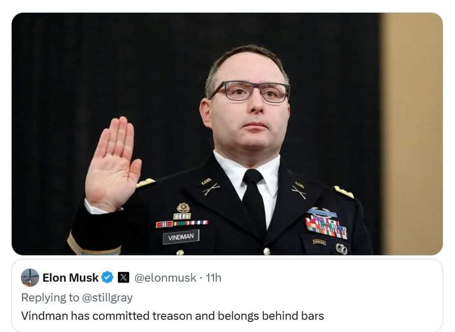 -Elon Musk nói ônng Alexander Vindman nhận tiền của các nhà tài phiệt Ukraine, ông đã phạm tội phản quốc và có thể phải đối mặt với án tử hình. Khi Elon nói hẳn nhiên đã có bằng chứng. Vì nói khơi khơi có thể mất vài chục triệu như chơi.