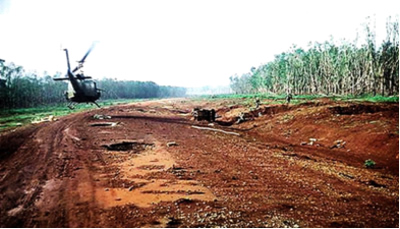 Thằng Meadows đưa ngón tay cái lên làm dấu là đã báo cáo cho FAC xong. Tôi cho nó biết mình phải phá cây làm bãi đáp cho trực thăng xuống. Nó không suy nghĩ nói OK ngay. Tôi quan sát thấy hướng Đông Nam có đám rừng thưa, toàn là cây chồi, không to lắm. Tôi cho lịnh toán tiến về hướng đó. Đi được khoảng 200 thước thì thấy dưới triền đồi hơi thoai thoải, rừng thưa, cây to chỉ bằng bắp vế. Đảo mắt nhanh một vòng, ước lượng chu vi rộng đủ cho một trực thăng đáp xuống được mà cánh quạt phải không chém vào cây, tôi quyết định chọn nơi này làm bãi đáp. Vì là triền đồi nên nước chẩy xuống tạo thành một khe khá sâu như một con suối cạn. Tôi bảo đẩy 2 thằng tù binh xuống dưới đó. Định tọa độ xong, đưa cho thằng Charles gửi lên cho FAC. Một mặt, tôi cho lấy giây chuyền nổ quấn chung quanh các thân cây, định bụng sẽ cho nổ mấy cây này trước vài phút để lấy chỗ cho trực thăng đáp xuống. Nuôi quân 3 năm, xài trong 15 phút. Với tay nghề của thằng James và 2 toán viên của tôi, việc dọn bãi trực thăng bằng chất nổ là 1 trong 15 bài dễ nhất của khóa “”Mìn bẫy & Phá hoại”. FAC cho biết trực thăng đã cất cánh. Nhìn đồng hồ, tôi tính phải 40 phút nữa trực thăng mới tới.