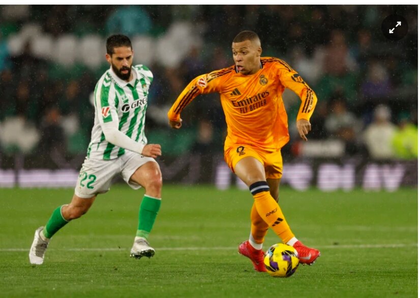 Kylian Mbappe chọc khe ấn tượng để Ferland Mendy áp sát khung thành. Hậu vệ người Pháp không dứt điểm mà chuyền ngang vừa tầm để Brahim Diaz dứt điểm cận thành, tung nóc lưới Betis.