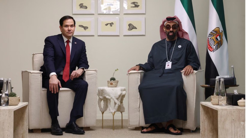 Ngoại trưởng Mỹ Marco Rubio chụp ảnh cùng Cố vấn An ninh Quốc gia UAE Sheikh Tahnoon bin Zayed Al Nahyan ở Abu Dhabi, UAE. Ảnh: Reuters.