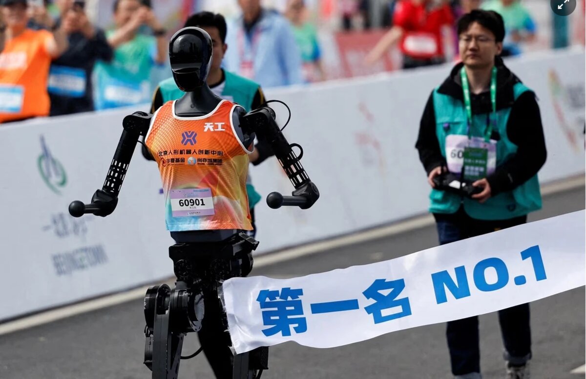 Tiangong Ultra, một robot hình người, chạy qua vạch đích và là robot giành vị trí đầu tiên trong Giải chạy bán marathon dành cho robot hình người E-Town, tại Bắc Kinh, Trung Quốc, ngày 19/4.