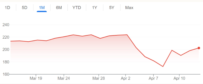 Sang tháng 4, mã này giảm liên tiếp 4 phiên từ ngày 2/4 - thời điểm ông Trump công bố chính sách thuế đối ứng và chỉ tăng trở lại khi Mỹ hoãn áp dụng 90 ngày với các đối tác thương mại, trừ Trung Quốc. Các nhà phân tích tại Morgan Stanley cho biết việc Mỹ miễn thêm thuế đối ứng với thiết bị điện tử sẽ giúp gánh nặng thuế hàng năm của Apple giảm từ 44 tỷ USD trước đó về 7 tỷ USD.