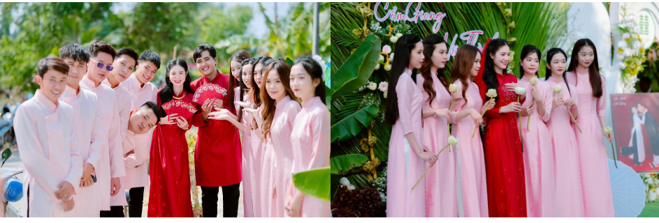 Trong đám hỏi, Giang mặc chiếc áo dài cưới và trùm khăn voan giống mẹ năm nào. Ngày cưới, cô cũng chọn chiếc váy cưới theo phong cách thập niên 90. Đó là những điểm nhấn đặc biệt trong đám cưới của cô dâu Kiên Giang.