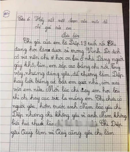 Cụ thể, cậu bé viết: "Chị gái của em là Diệp, 19 tuổi rồi. Chị đang học làm dược sĩ trong Vinh. Do dịch Covid-19 nên chị học online ở nhà. Dáng người gầy khô, lùn, em sắp cao bằng chị rồi. Tuy vậy nhưng đáng yêu, dễ thương lắm. Diệp hay lười biếng, cứ bắt em quét nhà, còn sai vặt em nữa. Mỗi lúc chị dạy em học bài, thì chị hay cục súc, la mắng em. Chị chưa có người yêu, hôm trước anh Nam bảo yêu chị Diệp nhưng chị không yêu vì anh Nam không biết hút thuốc lào. Chị Diệp yêu Quý lắm và Quý cũng yêu chị lắm".