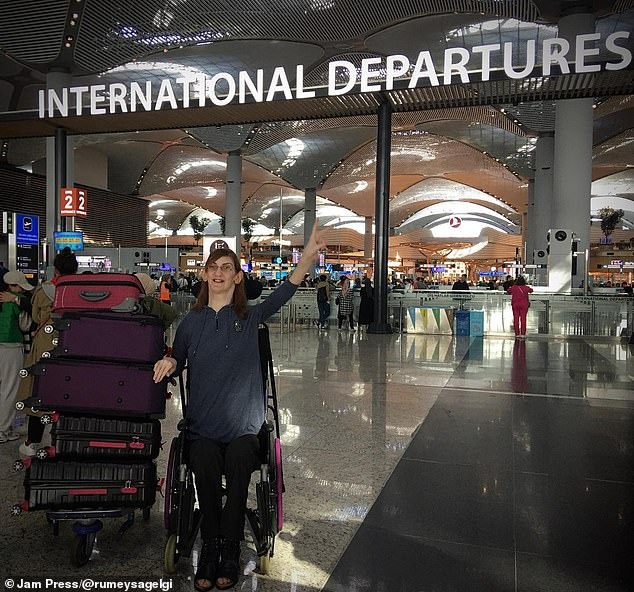 Cô phải nằm trong suốt chuyến bay vì không ngồi được ghế thông thường. Ảnh: Jam Press/@rumeysagelgi