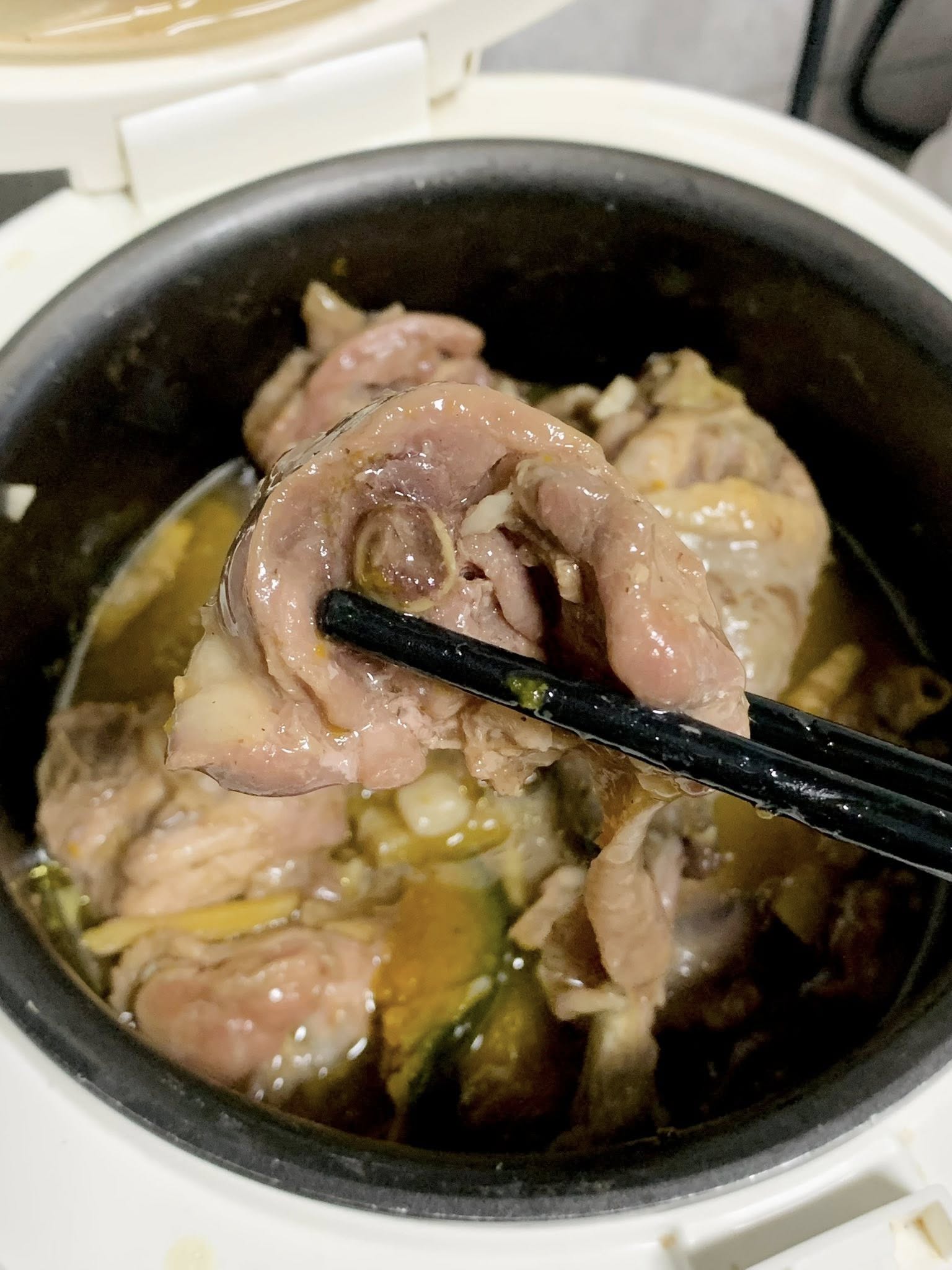 Gà mềm mọng nước. Rau củ có sẵn nước nên khi hấp xong th́ sẽ có canh trong nồi
