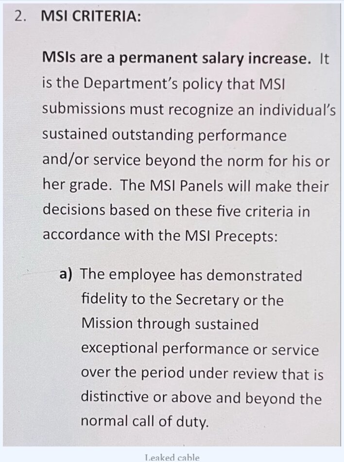 Một bức điện chưa từng được công bố trước đây, đề ngày 15 tháng 8, mời các giám sát viên đề cử các nhà ngoại giao và nhân viên hỗ trợ để nhận thưởng tiền mặt khi họ "thể hiện lòng trung thành với Ngoại trưởng" theo chương trình "Tăng cường Dịch vụ Xuất sắc" (MSI).