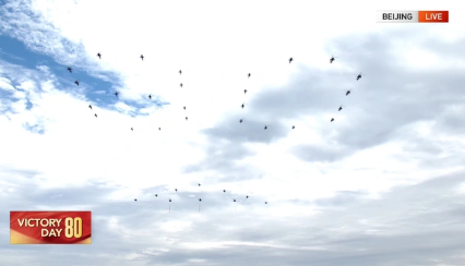 Phi đội trực thăng bay qua Quảng trường Thiên An Môn. Các trực thăng bay đầu mang theo cờ của Đảng Cộng sản Trung Quốc, Cộng hòa Nhân dân Trung Hoa và Quân Giải phóng Nhân dân Trung Hoa.