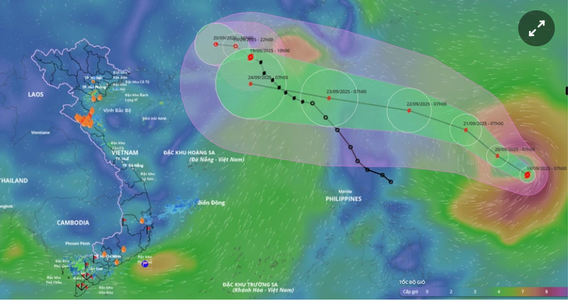 Theo Trung tâm Dự báo Khí tượng Thuỷ văn Quốc gia, vào 7h sáng 19/9, tâm bão Ragasa cách đảo Luzon của Philippines khoảng 1.000 km về phía đông với sức gió mạnh nhất cấp 8 (62-74 km/h), giật cấp 10.