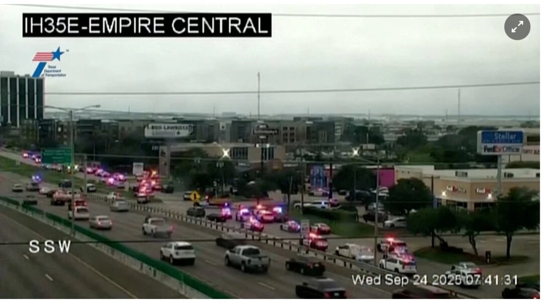 Xe cảnh sát và xe cứu thương đậu bên ngoài một cơ sở ICE nơi xảy ra vụ xả súng ở Dallas, bang Texas, Mỹ, ngày 24/9. Ảnh: Cơ quan giao thông Texas.