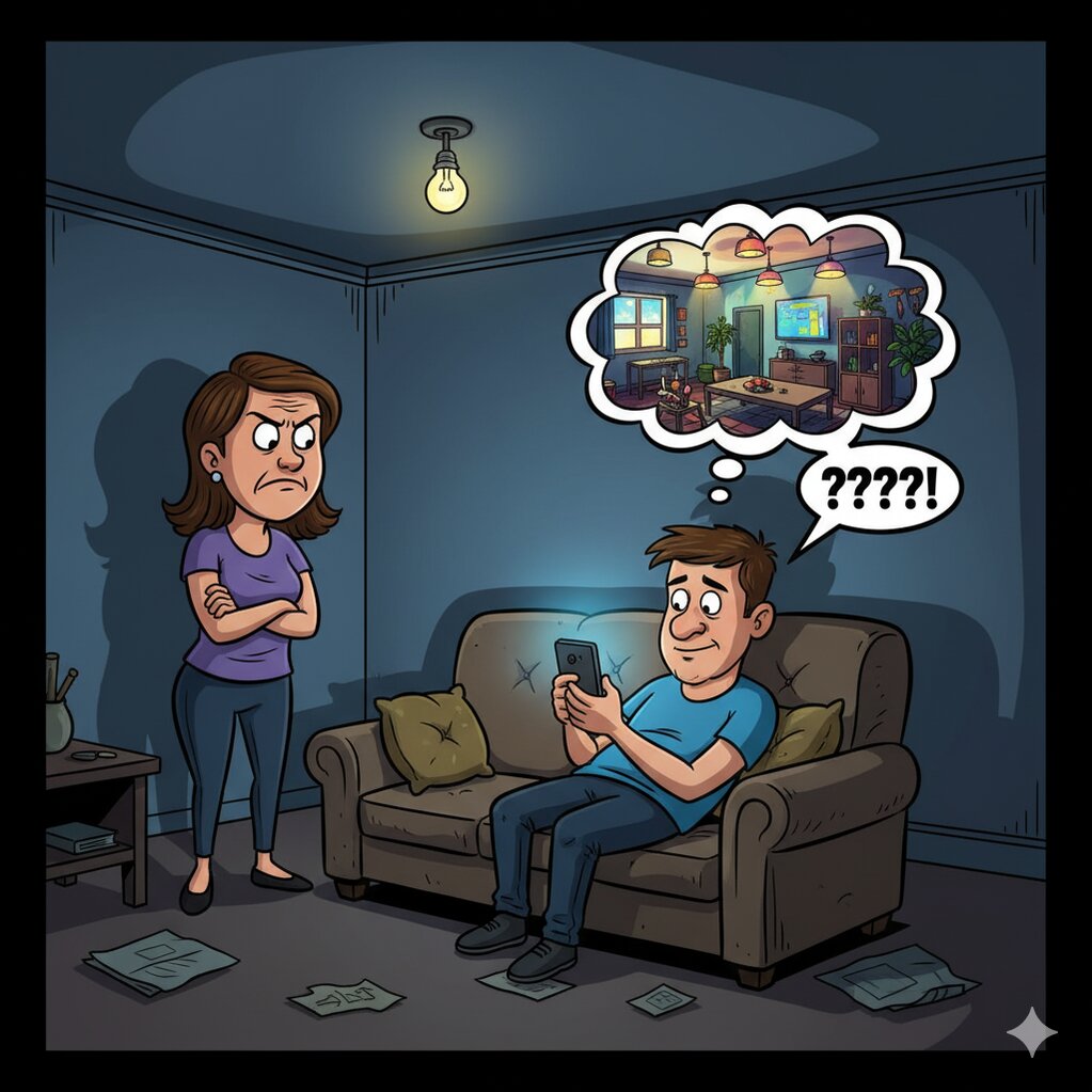 Một ông chồng vốn nổi tiếng tiết kiệm. Tối nào cũng tắt hết đèn trong nhà, chỉ bật mỗi cái đèn nhỏ ở phòng khách.