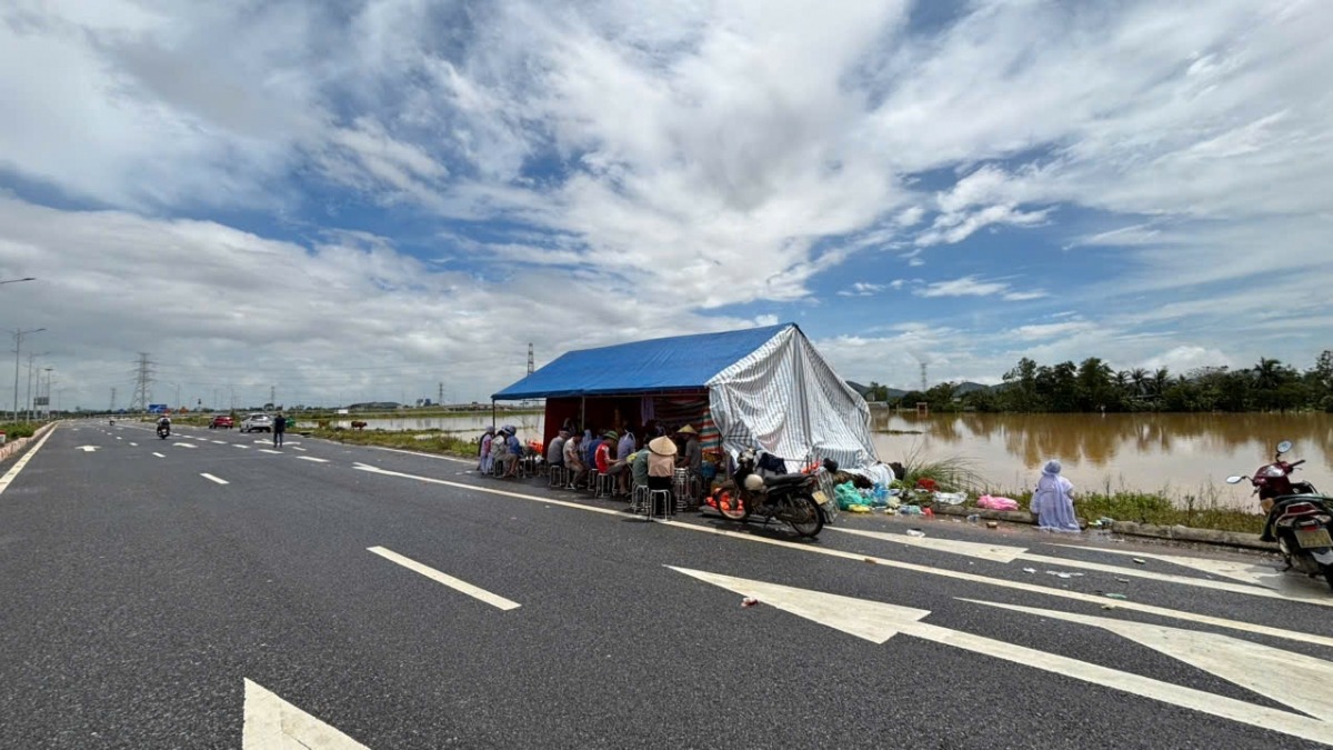 Người nhà nạn nhân dựng lều tạm ven đường để lập ban bàn thờ hai bà cháu, trong lúc chờ nước rút mới có thể an táng.