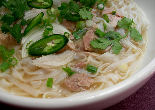 – Sau đó là việc khá quan trọng khác là nêm nước dùng. Nếu khẩu vị của bạn nhận thấy là nước dùng của mình đã ngon vị xương thịt, gia vị… thì chỉ cần thêm muối trong khoảng non 1 ½ muỗng cà phê / 1 lít nước dùng. Nên nêm cho nước dùng đậm đà chứ không mặn, thực khách sẽ tùy ý nêm riêng bằng nước mắm. Giữ nóng nước dùng trên bếp. (Ở đây, xin mở một dấu ngoặc về vấn đề sử dụng bột ngọt mà người Bắc VN thường gọi là mì chính, người Huế gọi là vị tinh. Đa số người Việt ở Mỹ chẳng hạn rất hạn chế và gần như không dùng đến bột ngọt nhưng nếu các bạn đã ăn phở tại… VN thì từ Bắc chí Nam xin xác nhận các tiệm phở hầu hết đều sử dụng bột ngọt để nêm thêm trong nứơc dùng. Phân lượng ít nhiều là tùy quan niệm khẩu vị người nấu, tùy tính toán kinh doanh và tùy cả thực khách vì khá nhiều tiệm phở tại Hà Nội chẳng hạn vẫn để cả chén bột ngọt trên bàn cho khách tuỳ thích nêm thêm. Sự tai hại trong việc sử dụng bột ngọt với số lượng và thời gian như thế nào đó thì ai cũng biết nhưng lỡ như bạn nấu phở ở Mỹ chẳng hạn mà cứ thấy nó thiếu thiếu cái gì đó so với phở ăn tại VN thì có thể là do bột ngọt!).