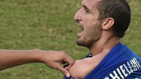 Chiellini tố cáo bị Suarez cắn vào vai.