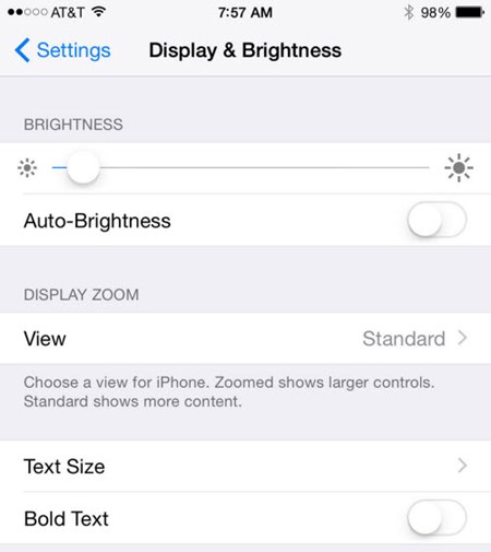 Settings > Display & Brightness > chuyển Auto-Brightness sang chế độ off. Sau đó bạn có thể tự mình kéo thanh trượt Brightness để thiết lập độ sáng màn hình bằng tay. Tính năng tự động thay đổi độ sáng màn hình sẽ liên tục sử dụng cảm biến ánh sáng, đây là một trong những lý do khiến hao tốn pin.