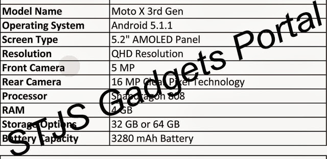 Ngoài ra, smartphone Moto X sẽ sở hữu camera chính độ phân giải 16MP, camera phụ 5MP cùng 1 pin dung lượng 3.280 mAh và chạy hệ điều hành Android 5.1.1 Lollipop ngay khi xuất xưởng.