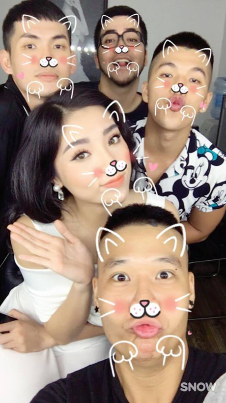 Kỳ Duyên nhí nhảnh chụp hình cùng ê-kíp, dường như Hoa hậu đã quên đi mọi chuyện trong quá khứ.